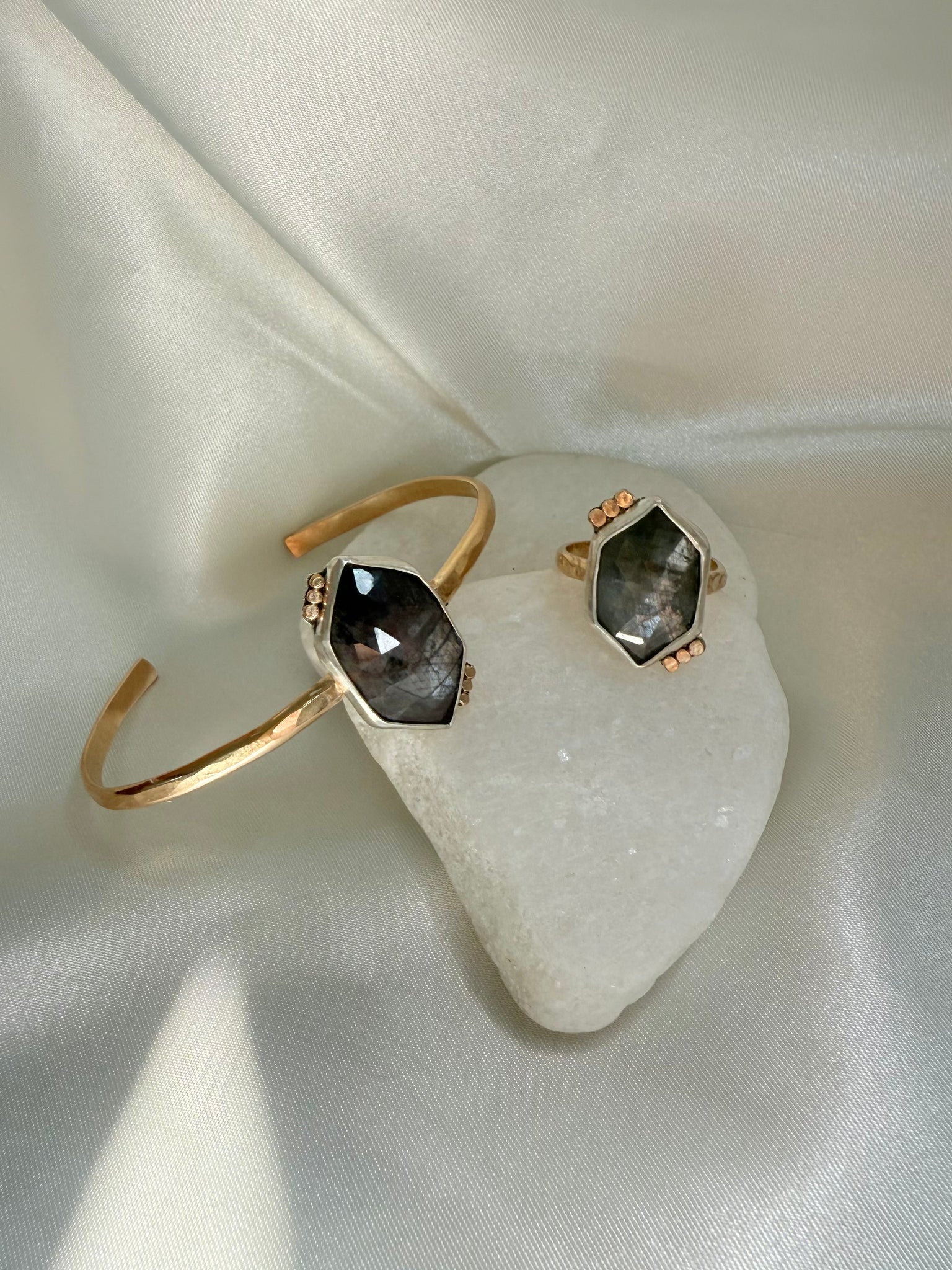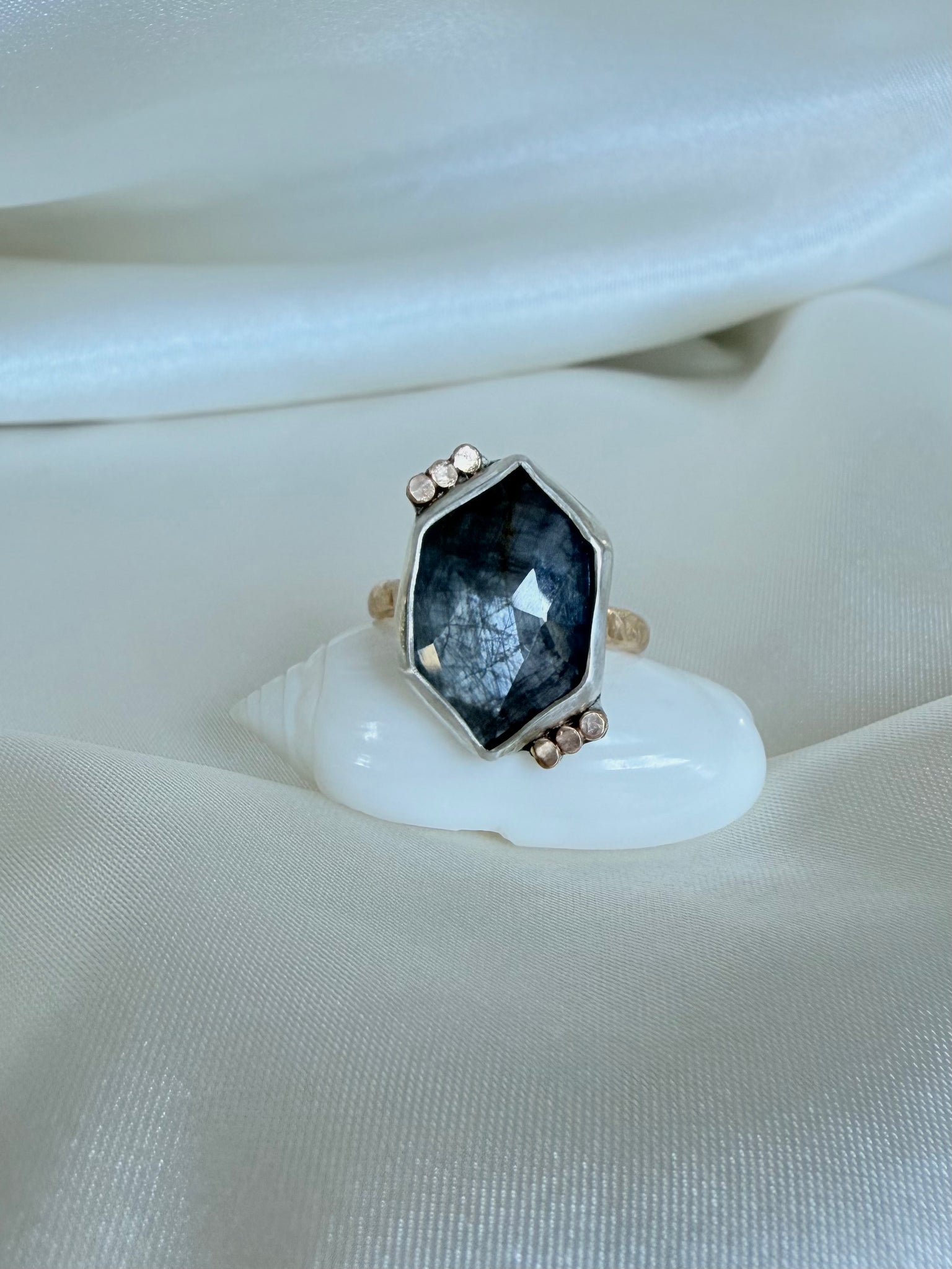 This is an amazing rose cut rare White Sheen Sapphire that is set in a fine and sterling silver bezel with 14k gold filled accents.