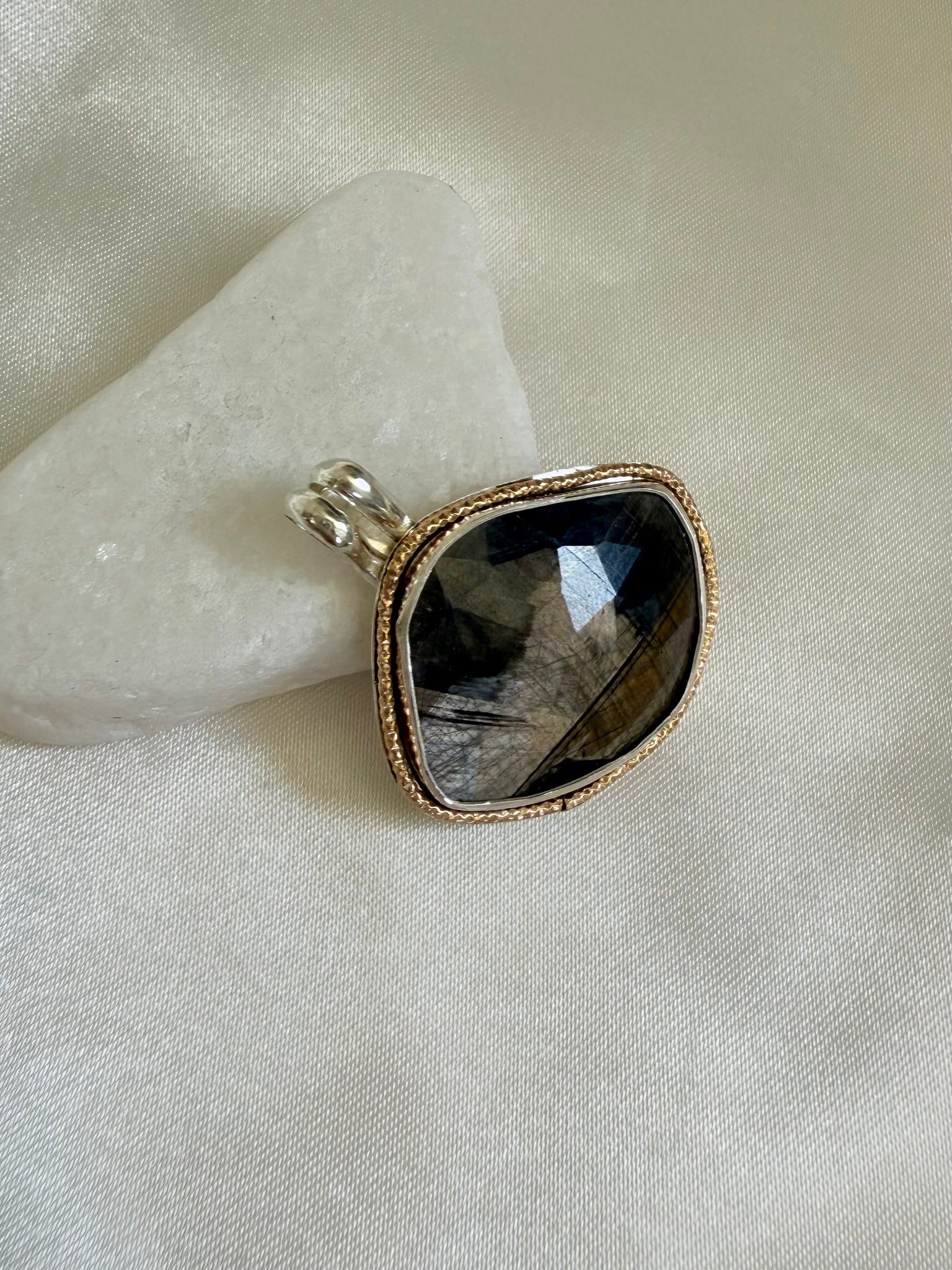 This is a beautiful rose cut Gold Sheen Sapphire stone, they are so rare!! Its setting is hand soldered with silver and gold to give it a look like no other. The setting is made with fine and sterling silver with a 14k gold filled sparkle texture accent around the setting. This is sold as just a pendant. If you’d like chain please contact us for chain selections.