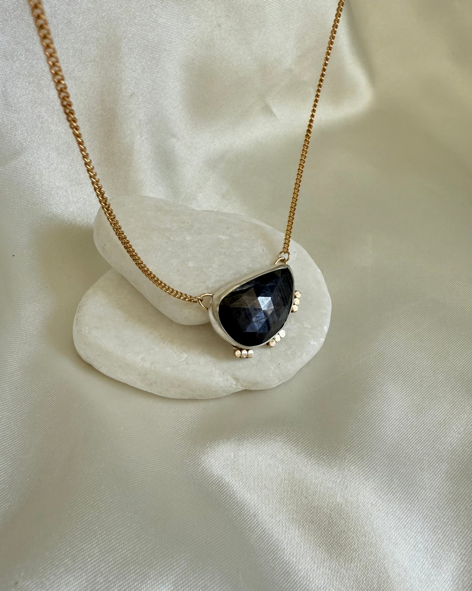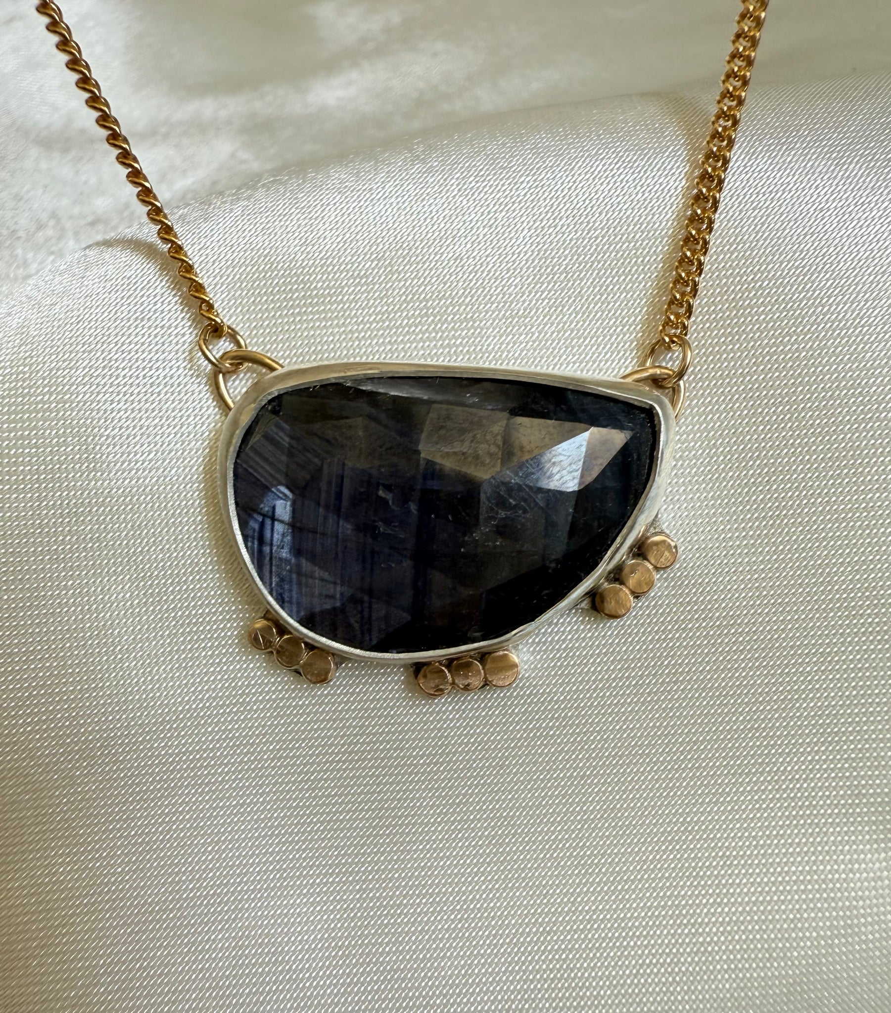 This is an amazing rose cut Deep Blue Sapphire that is set in a fine and sterling silver bezel with 14k gold filled accents. The chain is a curb chain, 14k gold filled. Length is 16”-18”.