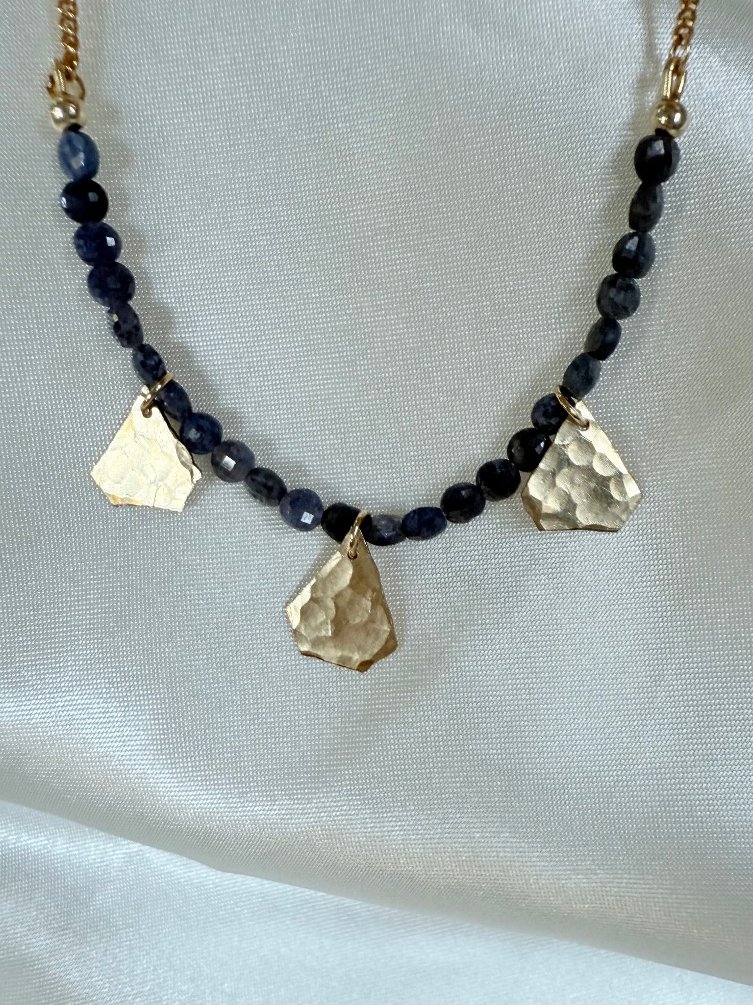 This is made with round faceted Sapphire beads hand stung with abstract hammered gold pendants. It is hanging on a small curb chain. All materials are 14k gold filled. Length is 15.5-17.5”.