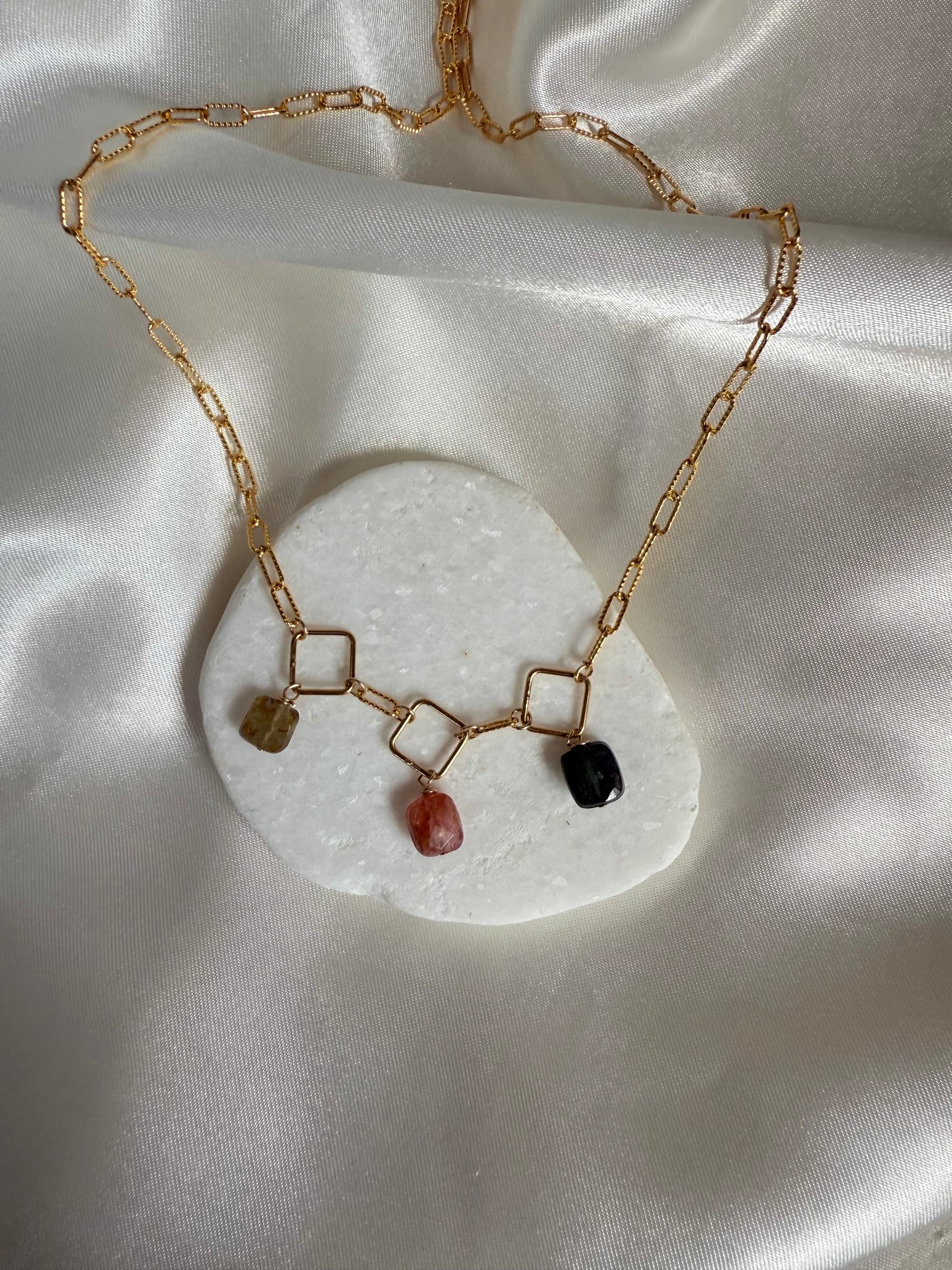 This is made with tourmaline stones, they are fall colors, mauve, light green and dark green. They are hanging in a fun style on diamond shaped pendants on our textured paperclip chain. Length is adjustable anywhere on chain.