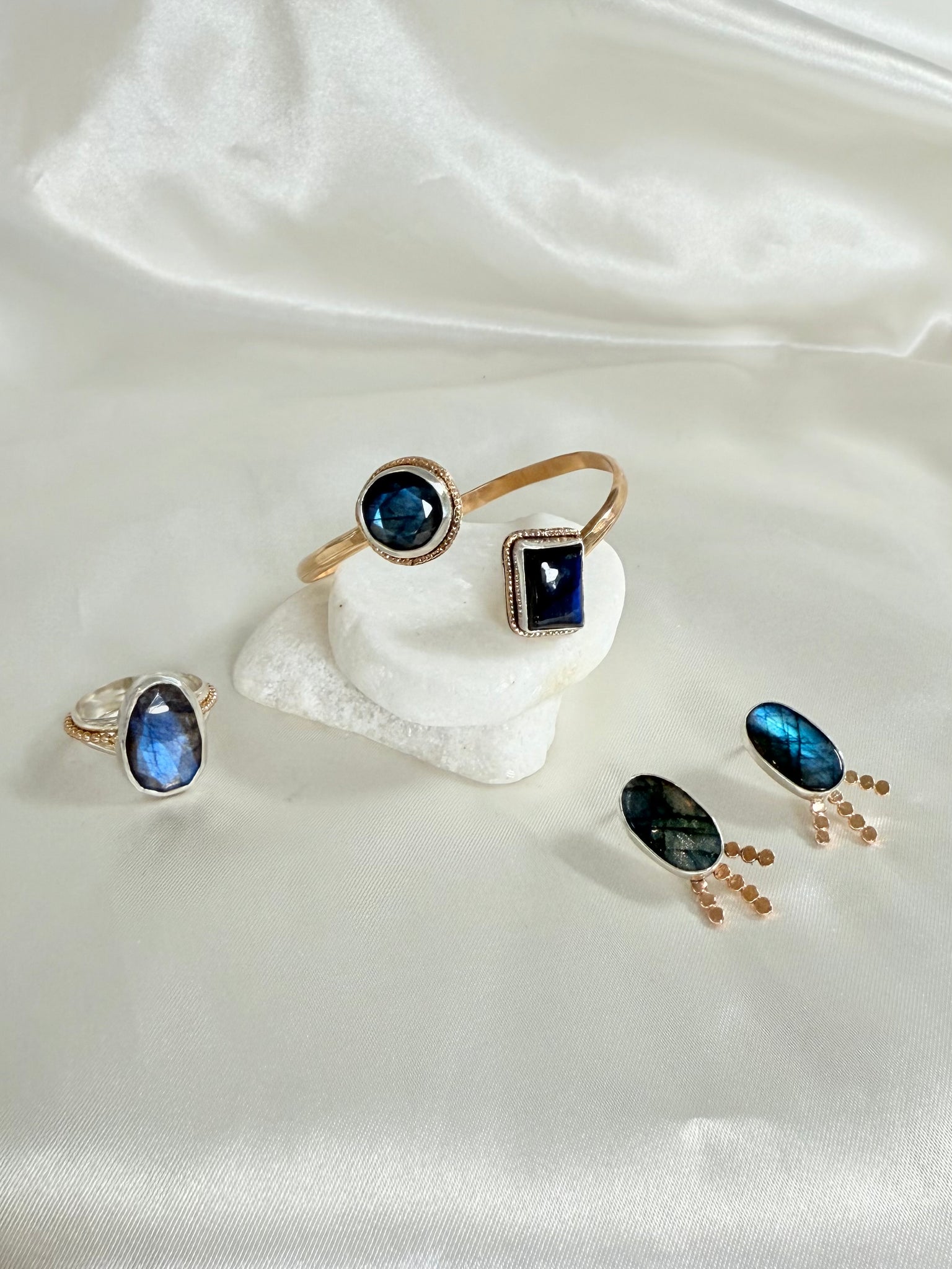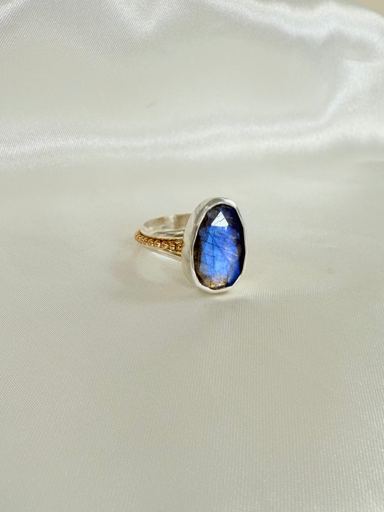 This is an amazing Labradorite stone bezel set in fine and sterling silver. The hand is sterling silver with a gold ball band accent.