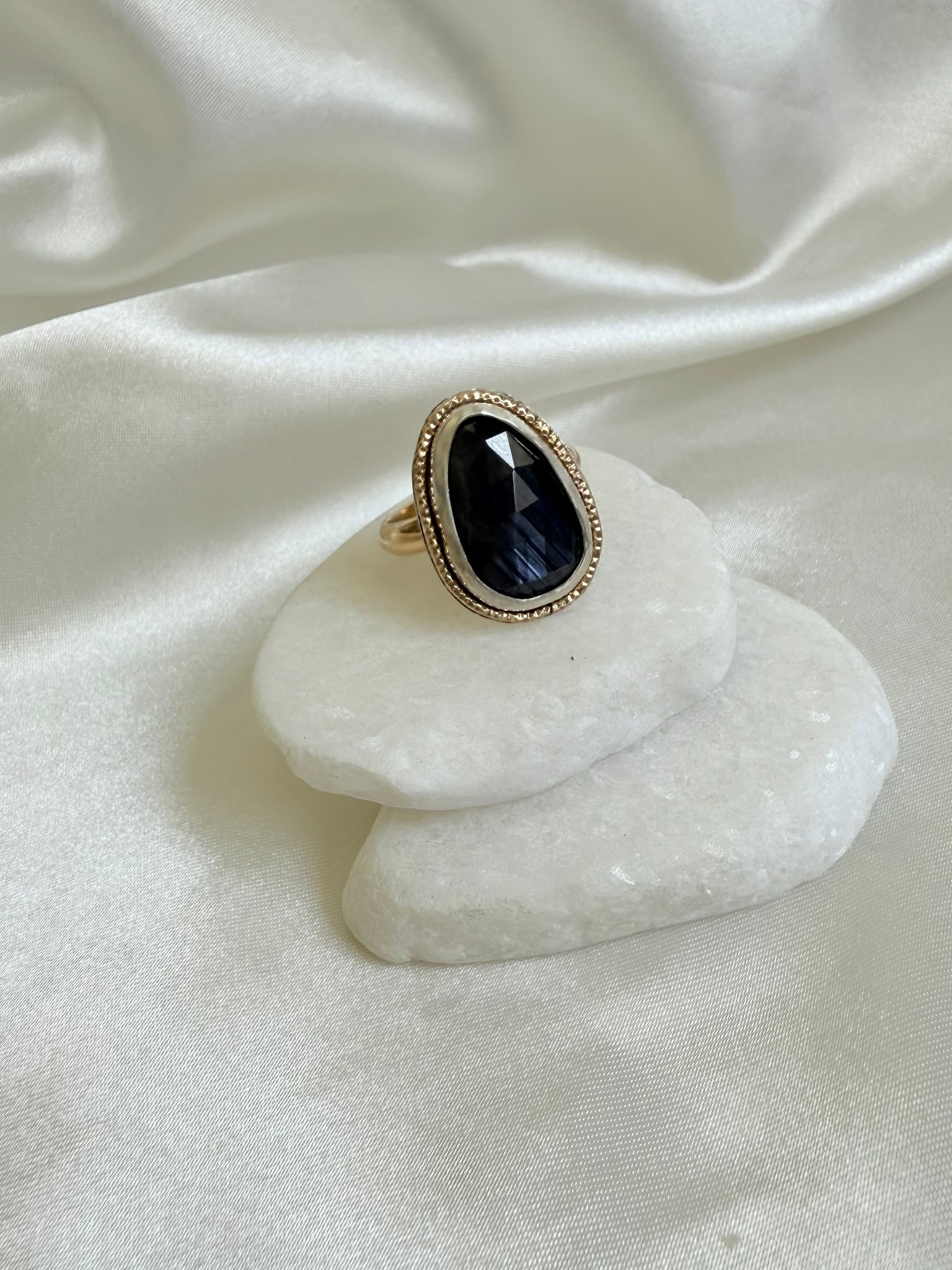 This ring is made with a beautiful rose cut sapphire stone. Its setting is hand soldered with silver and gold to give it a look like no other. The setting is made with fine and sterling silver with a 14k gold filled sparkle texture accent around the setting. Size of this ring is a 7. Not you size? Please contact us and we would love to make one just right for you!